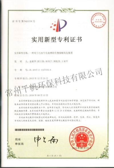 實(shí)用新型專利證書 一種用于污水生化處理的生物接觸氧化裝置