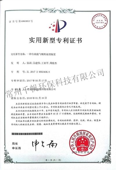 實(shí)用新型專利證書 一種有機(jī)廢氣吸附處理裝置