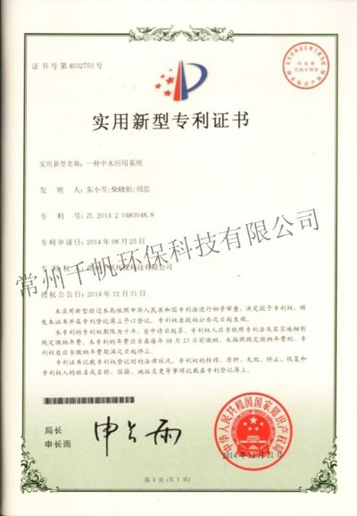 實(shí)用新型專利證書 一種中水回用系統(tǒng)