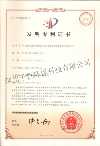 發(fā)明專利證書 模擬土壤污染物遷移及土壤修復(fù)的實(shí)驗(yàn)裝置及實(shí)驗(yàn)方法