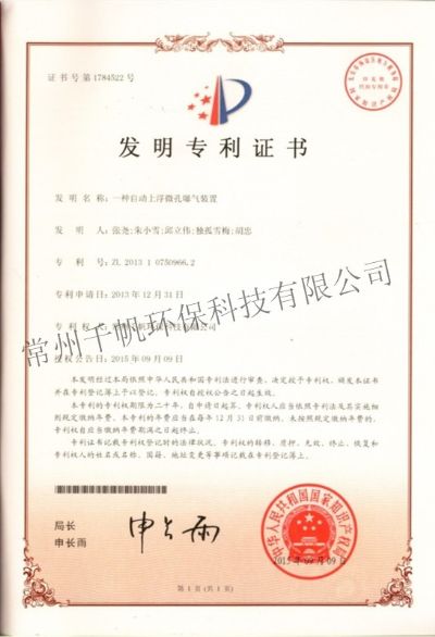 發(fā)明專利證書 一種自動(dòng)上浮微孔曝氣裝置