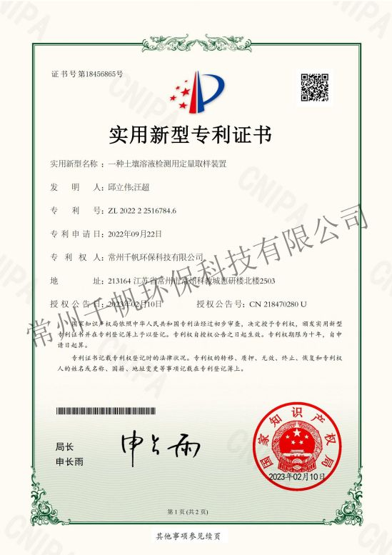 實(shí)用新型專利證書 一種土壤溶液檢測用定量取樣裝置